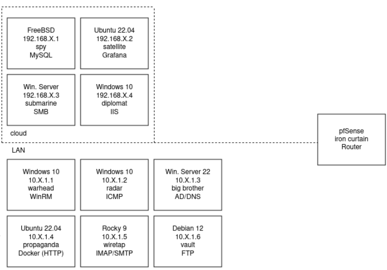 Similar to UB Lockdown the goal was to keep the services on all of our boxes running wile the red team attacks them. Each team was given 5 Ubuntu machines that we could use to access the console, scoring engine, and points shop. For our infrastructure, we had 3 Windows boxes, 3 Linux, and a PFsense router with console access. On our cloud network we had 2 more Windows and Linux boxes, which we had to SSH into it from one of the machines with console access.