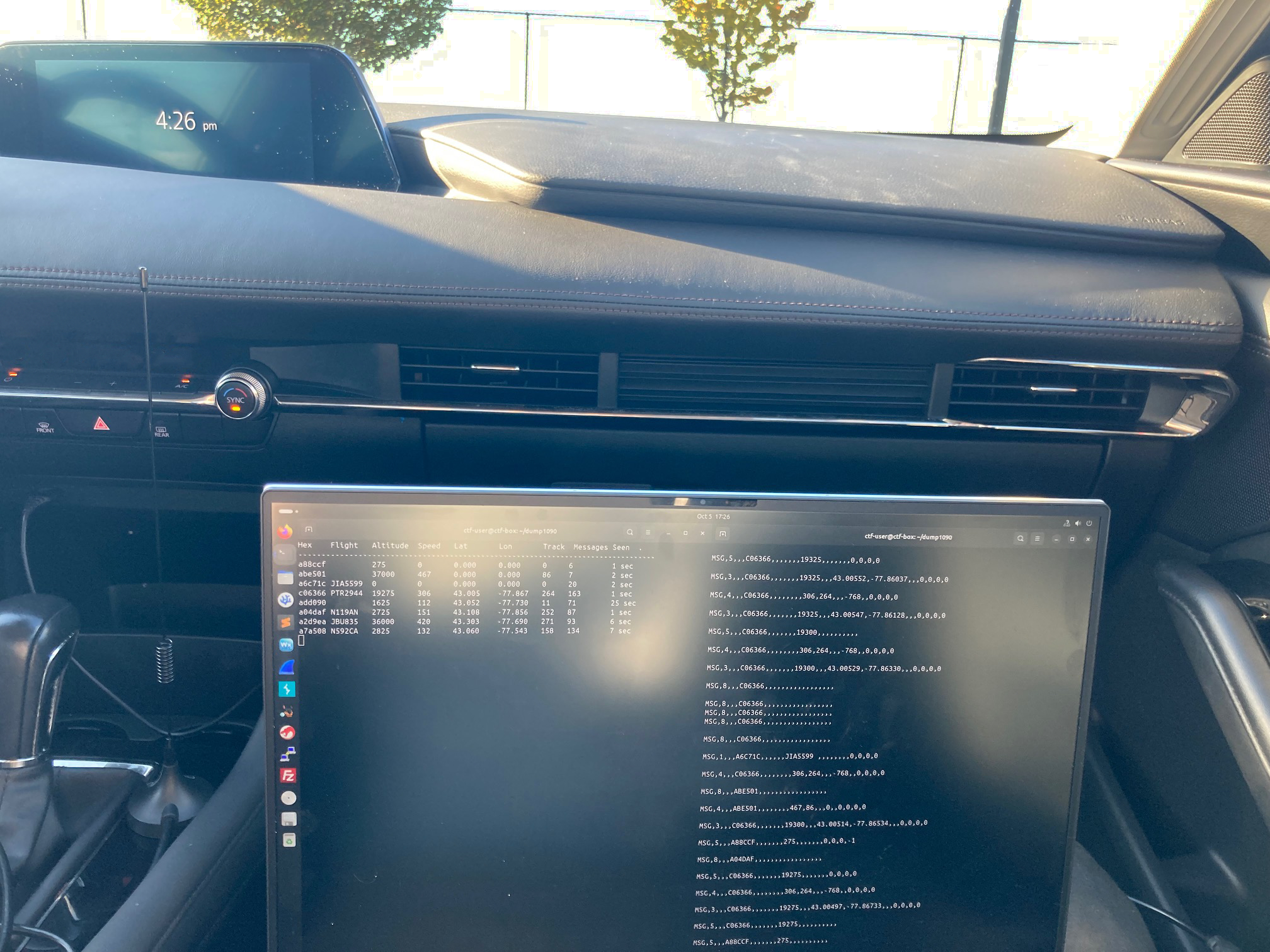 Here's my setup: I have a Nooelec RTL-SDR, with the antenna included in their kit. This isn't ideal for capturing mode S as it's 1090 MHz, but I am close enough to the airport that I should still be able to capture some good data. For software, I'm using dump1090, a simple ADS-B receiver and decoder that also has a built in web UI for viewing the captured data on an interactive map. I wrote a python script to get the data from dump1090 and attach a time stamp to each message.
